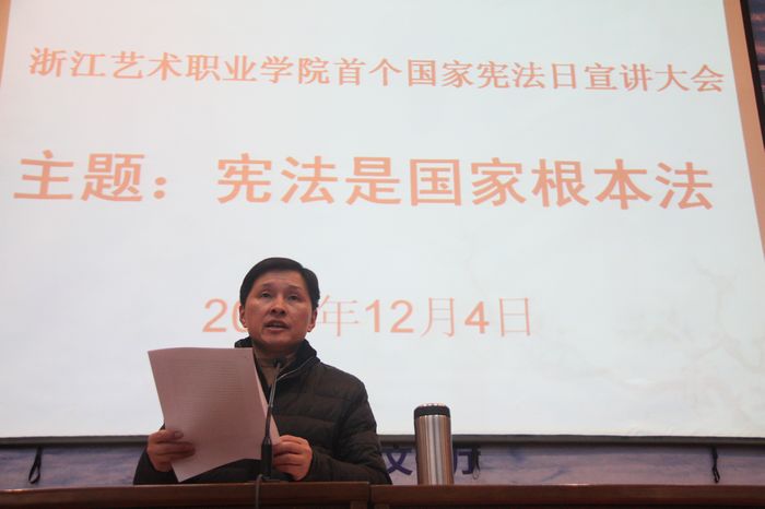 浙江艺术职业学院党委高度重视首个国家宪法日宣传活动,党委书记林国荣,党委副书记、副院长朱海闵,党委副书记黄杭娟和相关职能部门负责人专门研究部署学院国家宪法日宣传教育活动,拟通过宪法日大会宣讲、中心理论组学习、形势与政策讲座、宪法晨读、特别升国旗仪式、座谈会、视频播放、校园广播、官网官微宣传、校报宣传栏宣传、资料发放和学习等形式,组织全院师生学习十八届四中全会精神、《习近平总书记在首都各界纪念现行宪法公布施行30周年大会上的讲话》、《宪法》和其他相关学习资料,多形式多途径开展法治宣传,形成声势,扩大受众,突出宪法知识教育,使“宪法是国家根本法”的意识深入人心,使宪法常识、法治知识进课堂、进头脑。
