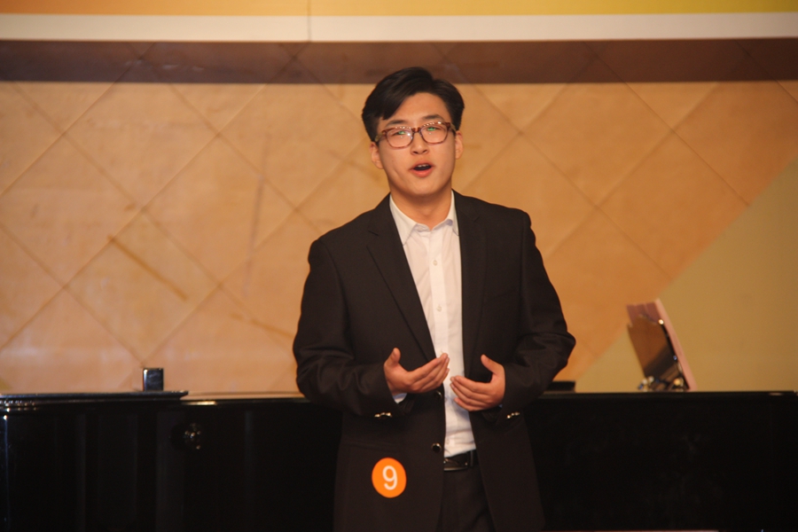 上午九点半,大赛在音乐厅正式拉开帷幕。第一轮比赛首轮环节为“歌曲演唱”,选手自选两首歌曲现场演唱,时间控制在10分钟以内,重点考查选手演唱技能、音乐表现和舞台实践能力。选手们的选择曲目范围广泛,风格多样,既有《我亲爱的爸爸》《美妙时刻即将来临》这样的歌剧咏叹调,也有《高山流水》《梁祝新歌》这般的中国民族声乐作品,还不乏有《野子》《可惜不是你》等深受年轻人追捧的流行歌曲,舞台上可谓是美声、民族、流行三种唱法悉数过招、精彩不断。每位选手在演唱完两首曲目后,便进入第二环节“视唱测试”。 由选手现场抽取视唱题一题,大屏幕显示题面,选手准备1分钟时间后完整视唱一遍,重点考查选手的音乐素质和视唱能力。按照歌曲演唱满分100分折合总成绩的70%、视唱测试满分100分折合总成绩的15%评分权重,共有14名前60%的选手进入到了第二轮的比赛。