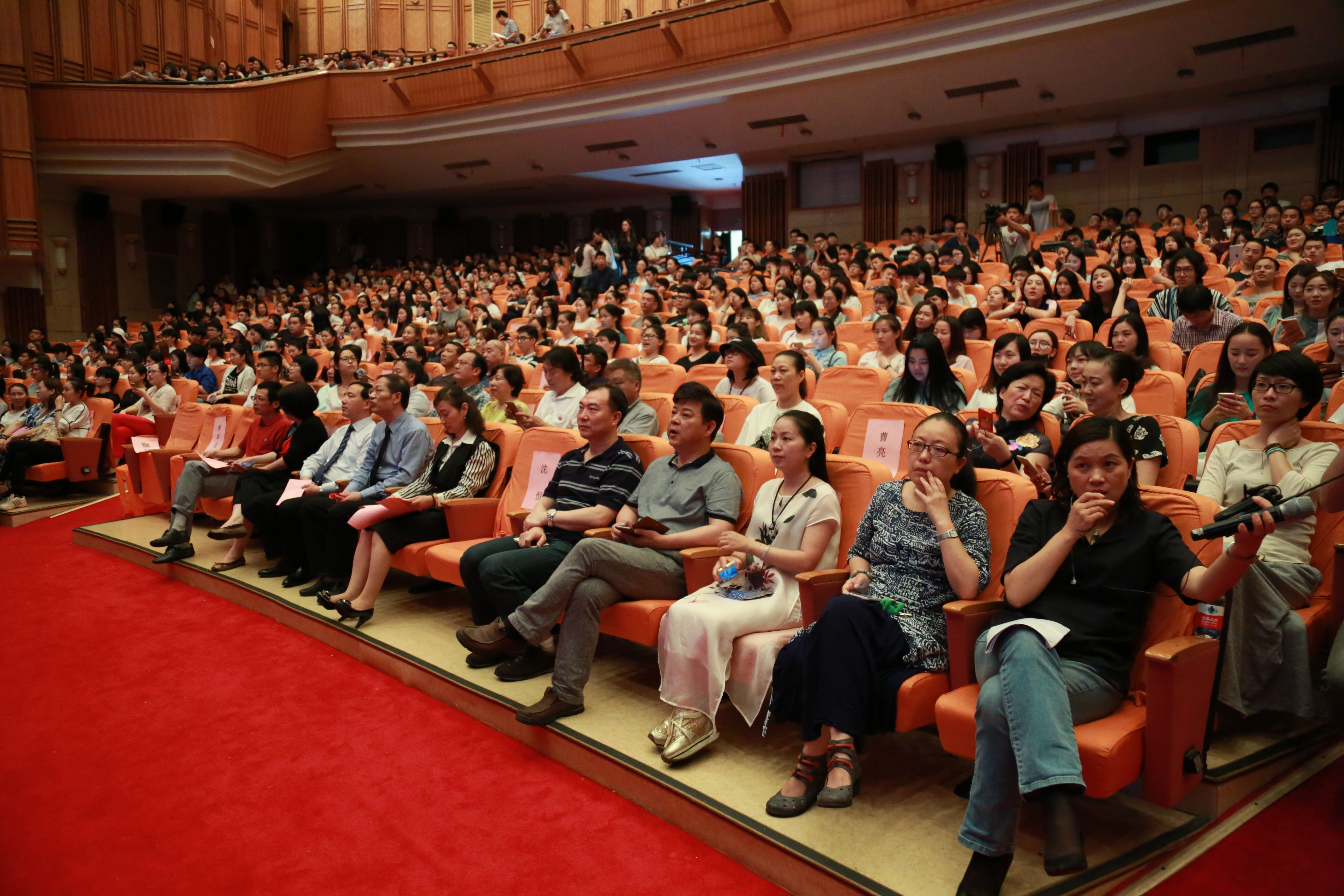上午10点,毕业典礼开始。开场视频一下就戳中毕业生泪点:开学报到时青涩稚气的模样,军训时老师挑战自我的激励,阳光下走正步的操练,开学典礼上对未来期许的目光,校训石前是靓丽的白衣红颜,舞台和教室里有鲜花和汗水相陪……原来那时的我们是这般模样,原来学校都帮我们记录下来了。“看,这是你啊!”“喂,我们班呀……”现场手机刷刷举起来,毕业生们说,我们要录下这段珍贵的记忆。