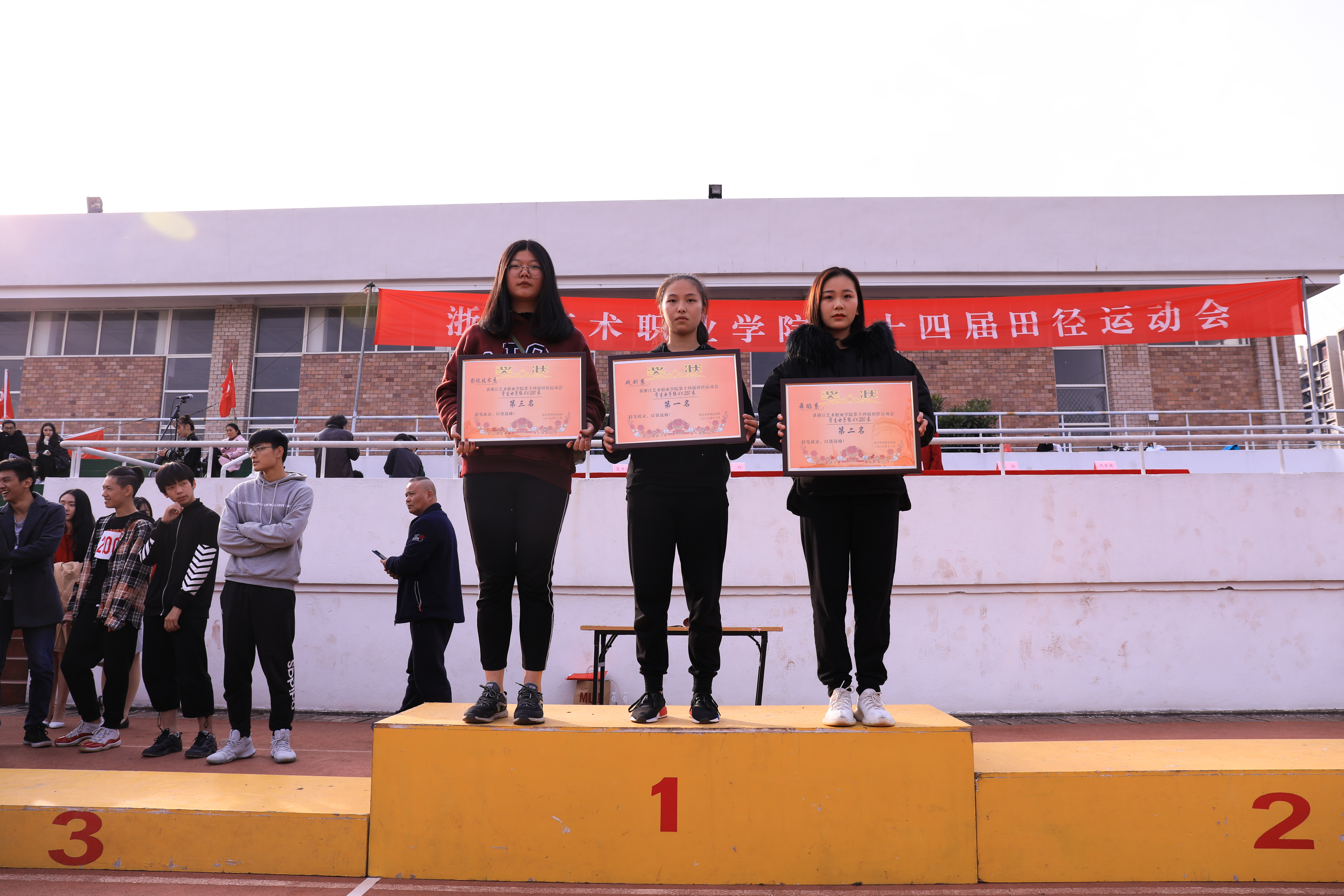 夏开堂宣布了本届运动会比赛成绩。戏剧系的运动员们用矫健的身姿,在六系中脱颖而出,以232分的总成绩遥遥领先,荣获团体第一名,影视技术系和音乐系分获第二、第三名,体育道德风尚奖由舞蹈系和音乐系获得,精神文明奖由影视技术系和美术系获得。影视技术系章雅富、文管系刘伟名分别以11″4811″53打破我校学生男子100米记录,音乐系郑伽勒以24″22的成绩打破我校学生男子200米记录。校领导分别为获奖代表颁发证书并合影留念。