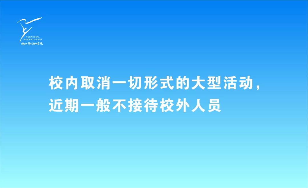 正月初一,学校官微推送《武汉加油!我们一起度过这个特殊新春!》,浙艺学子通过各种方式,为武汉送上祝福。1月26日,统计完成所有在校师生相关情况,对进出校园人员进行测温登记,非本校人员无特殊情况不得进入校园。
