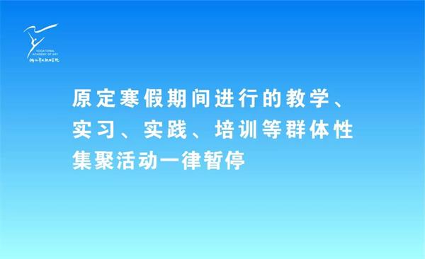 学校再次强调,原定寒假期间进行的教学、实习、实践、培训等群体性集聚活动一律暂停,校内取消一切形式的大型活动,近期一般不接待校外人员。如有途径湖北,特别是近期去过武汉,或者与武汉来的人员有过密切接触,请及时向社区和学校报告,提供相关接触信息,并做好自我隔离,居家观察14天。无特殊情况师生不要提前返校。学校已实行半封闭式管理,对进校车辆和人员实行严格登记、体温监测和健康筛查。新学期开学返校时,请自觉服从学校统一安排,配合学校做好健康筛查等各项排查工作。根据我省最新发布的大中小学校延期开学的决定,我校将延期至2月17日之后开学,具体开学日期另行通知。