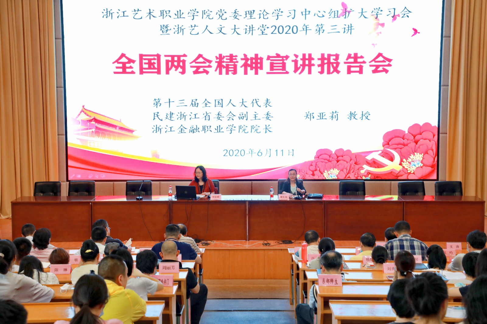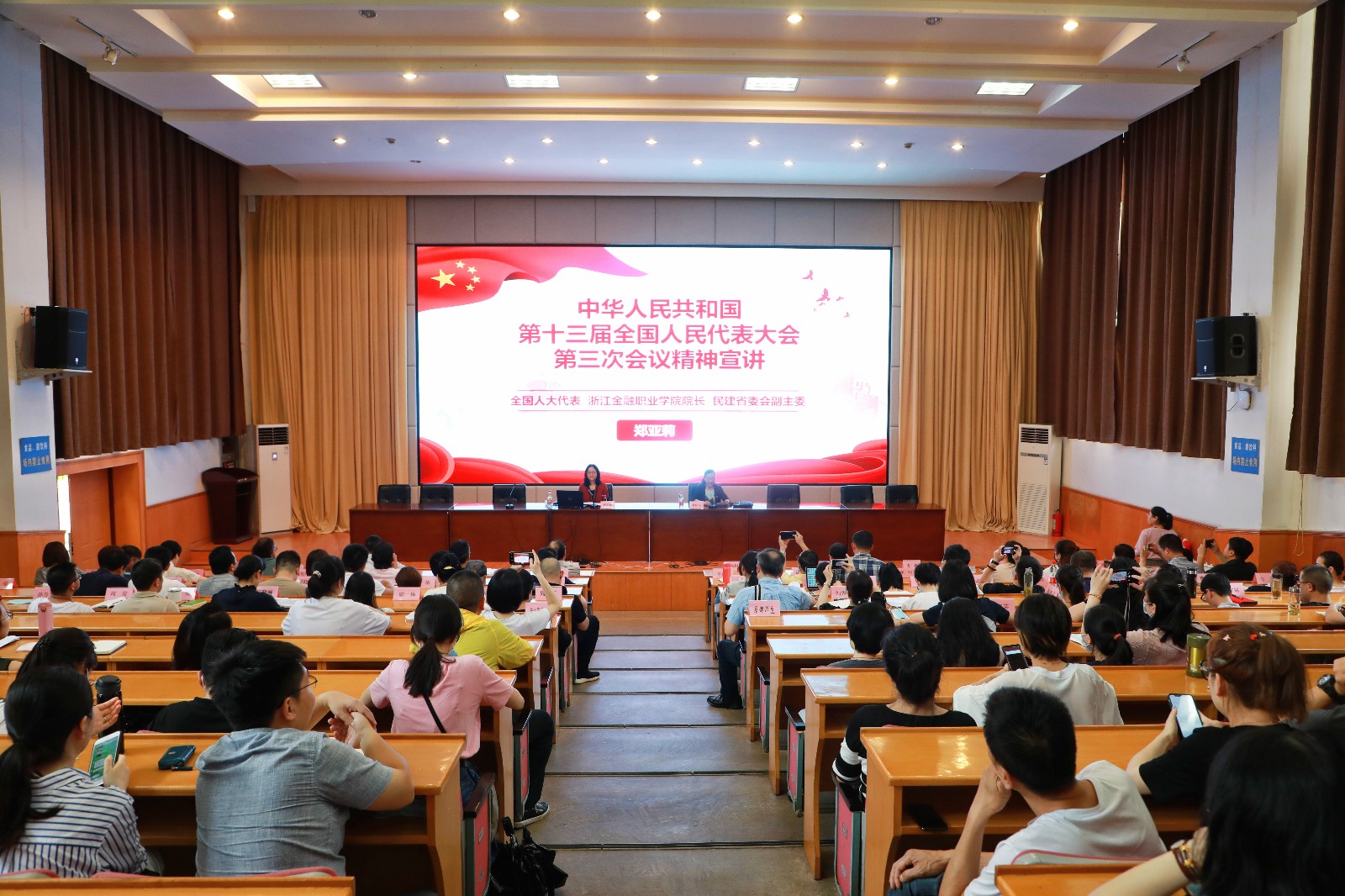 黄杭娟在报告会总结讲话中指出,2020年是不平凡的一年,突如其来的新冠肺炎疫情给我国带来了许多困难和挑战,全国人民付出了艰苦努力,疫情防控取得重大战略成果。备受瞩目的全国政协十三届三次会议和十三届全国人大三次会议在北京闭幕后,我校师生纷纷通过网络、电视、广播、新媒体平台、报纸等渠道积极关注两会动态,认真收听收看、学习研讨全国两会的有关内容。众所周知,这次全国两会是在“两个百年”交汇的历史关口和我国战“疫”取得重大战略成果的特殊时期、特殊背景下召开的。两会的顺利召开意义重大,为推动经济社会发展增强了信心、鼓舞了干劲、指明了方向。我们要把全国两会精神特别是习近平总书记重要讲话精神与习近平总书记对浙江的重要指示要求融会贯通起来,进一步坚定信心、攻坚克难,主动作为;要坚决扛起“重要窗口”的使命担当,在学习贯彻全国两会精神中锤炼最硬作风、务实推进工作。当下,我校正围绕“双高”目标任务,开展2020年度建设任务的推进实施,学校从省级示范校到省级优质校,一步一个脚印,直至成为197家“双高”建设单位之一,成为全国唯一入选“双高计划”的综合性艺术类高职院校,非常不易,我们既荣幸,也倍感压力,面临的挑战非常严峻。浙江金融职业学院是“双高”建设计划前50所高水平建设的学校,是我们学习的榜样,希望在建设过程中给予我们更多的支持和帮助。我们也将乘文化浙江、诗画浙江、高教强省建设的东风,依托行业资源优势,努力破解在高层次人才引进、产教深度融合、校内外资源整合等方面的瓶颈,深化改革创新、聚焦建设任务,落实项目责任,推进学校年度目标任务实现,奋力推进学校发展再上新台阶。