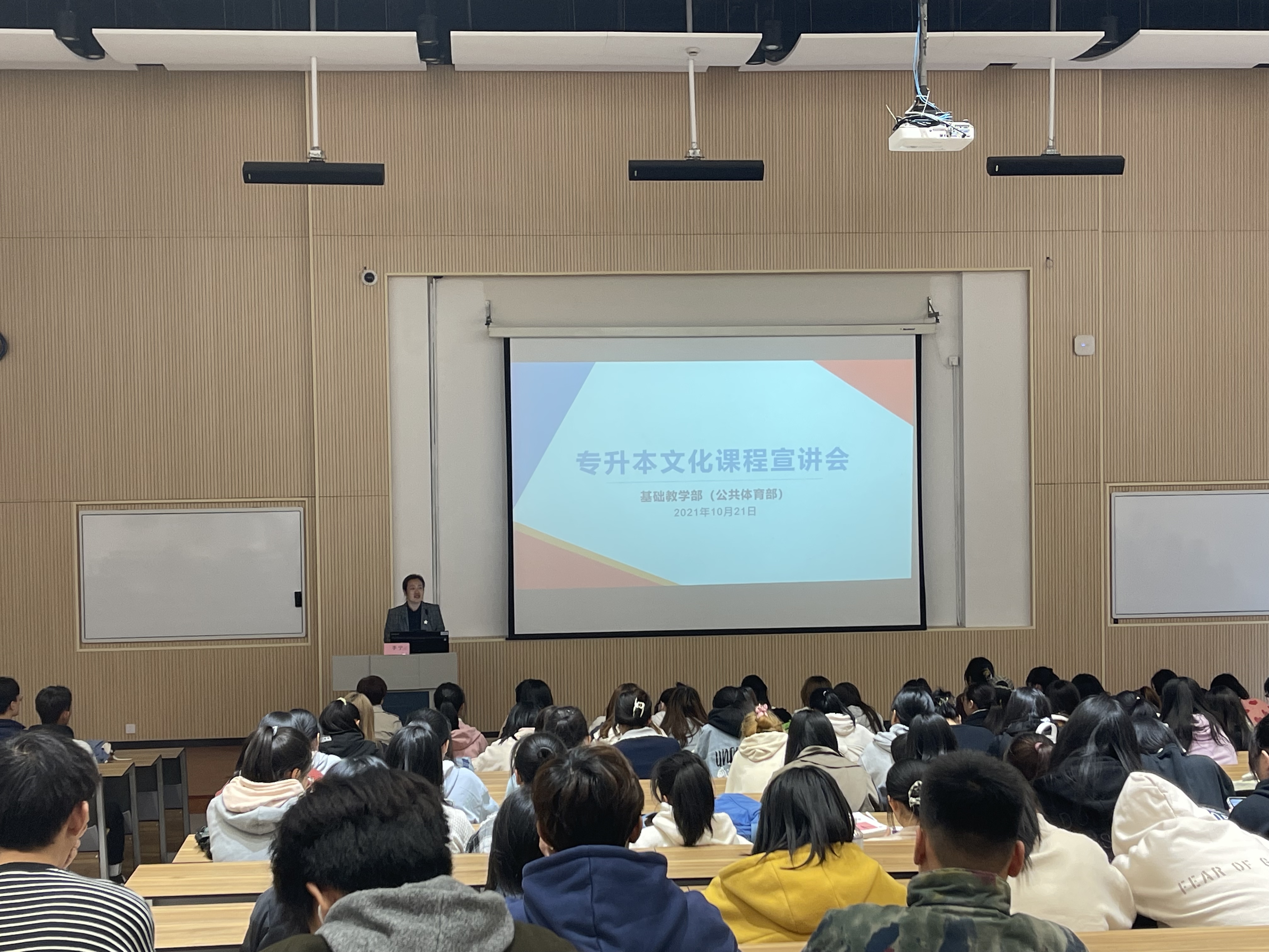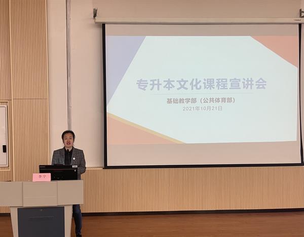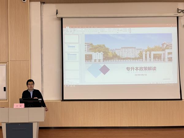 为解决同学们关于专升本的疑问,邀请招生就业办公室副主任顾斌和基础教学部副主任李宁作讲座。顾斌向同学们展示本校历年报考数据录取率以及往年全省招录比,让同学们更加直观的了解我校专升本情况。并对专升本政策进行解读,重点介绍统招专升本相关内容,如报考条件、考试科目、考试方式和试卷结构等内容,并详细分析专升本各类别所含专业对照。
