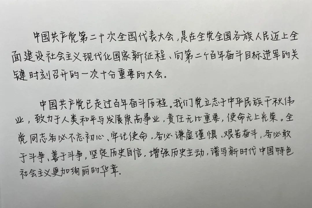 经过初赛的选拔,共有6位选手晋级复赛。选手们通过朗读党的二十大报告原文、手写文稿、提供相应的音频等形式,结合自身对党的二十大报告的体会,交流思想、分享感悟,朗读比赛现场气氛热烈,感染了现场的每一位观众,充分展现了演教学子紧跟时事、爱党爱国的良好风貌。在场的选手们不仅用朗读的方式表达了对党的二十大胜利召开的激动,更是用文字抒发了自己对党和祖国的尊敬与热爱。