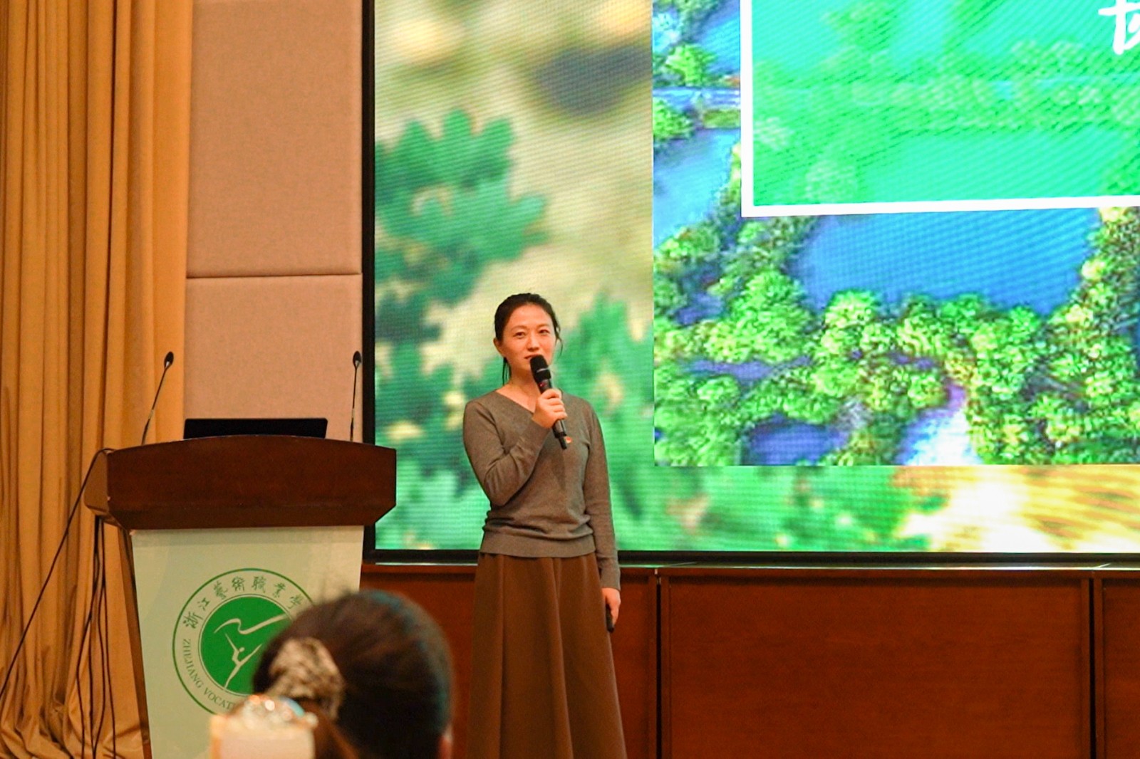 “习近平总书记在二十大报告中,27次提到奋斗,更强调了团结奋斗,可见,奋斗已成为习近平总书记讲话中的一个关键词,同时也成了中国人不变的信念。”基础教学部教师宣讲员魏晶晶以“十年伟大变革”为切入点,讲述了奋斗的中国和坚守信念努力奋斗的浙艺人,深情地表达了新时代新征程上的每一位中华儿女、每一位浙艺人都会因奋斗而更加幸福。