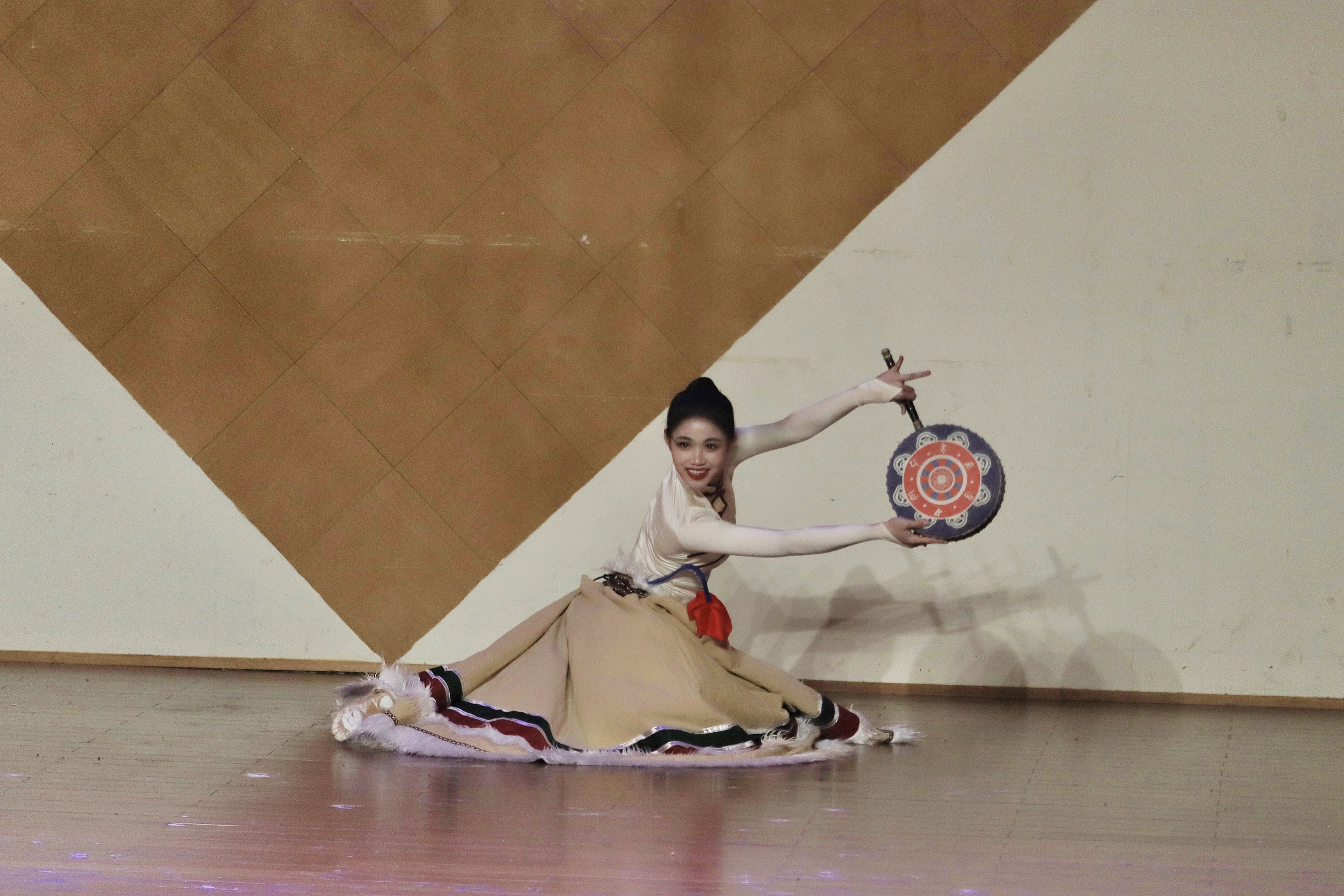 20歌舞班黄伊辰演唱新疆歌曲《打起手鼓唱起歌》,穿着一身新疆民族的服饰,拿着手鼓上场,把观众带入鲜花怒放碧草无垠的美丽新疆;展示傣族舞《花儿》展示傣族女儿该有的灵动和令人陶醉的柔美。