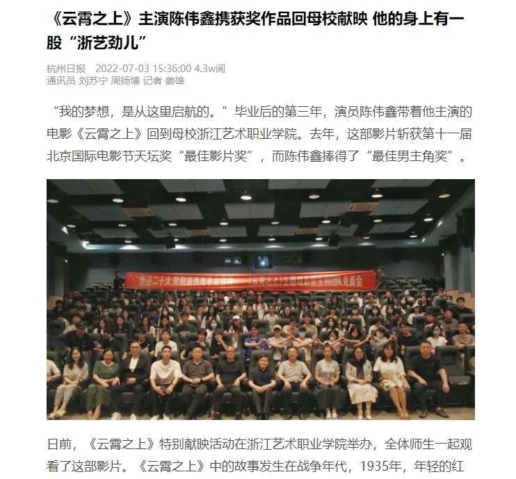杭州日报:《云霄之上》主演陈伟鑫携获奖作品回母校献映 他的身上有一股“浙艺劲儿”