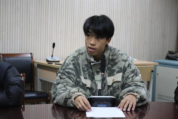22戏剧影视表演1班团支部孙仁东作为高职新团员代表发言,他表示,“我们入了团,并不意味着我们追求的结束,而是我们在自己的人生道路上有了一个更高、更新的目标。在这里,我代表新团员向各位老师与同学保证,我们会时刻牢记自己是一名光荣的共青团员,是先进青年的代表,是身边同学的榜样。为此,我们应该努力争做一名合格的、优秀的共青团员。希望老师们和广大同学们能够监督我们,让我们成为更优秀的团员。