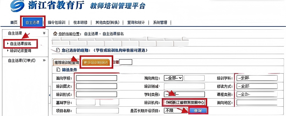 第二步:选择“自主选课”栏目→“自主选课报名”→“更多培训班筛选”→培训机构选择“060浙江省教育发展中心”(其他选项均选择“全部”)→点击“查询”→“报名”。