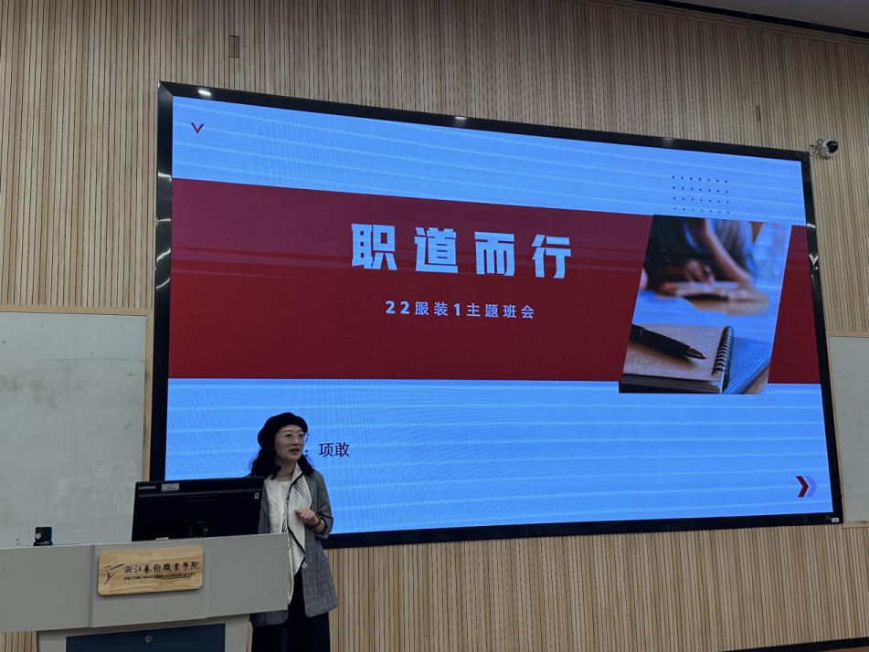 22服装1班班主任项敢以“职道而行”为题,通过案例让学生意识到学会职业规划的重要性,转变思维是职业的起点,培养成长型思维,引导学生制定职业规划发展目标,持之以恒学习、脚踏实地做事。